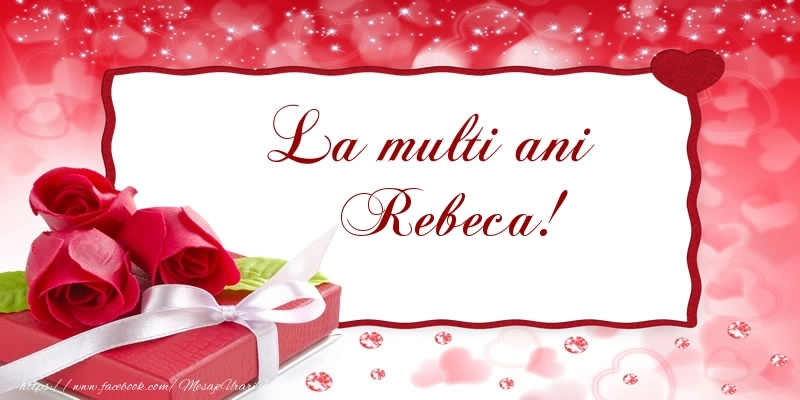 Felicitarea cu cadou și trandafiri în chenar roșu cu inimioare este ca o explozie de bucurie și culoare, iar numele Rebeca este adăugat cu gingășie pentru a personaliza această experiență de sărbătoare. Este modul tău de a spune la mulți ani într-un mod unic și special!