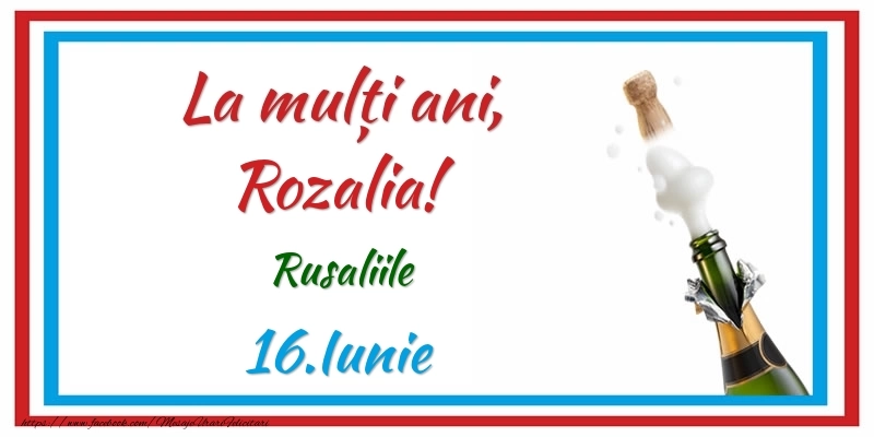 La multi ani, Rozalia! 16.Iunie Rusaliile | Felicitare cu sampanie pe fundal alb cu bordură roșu-albastru | Felicitari de Ziua Numelui