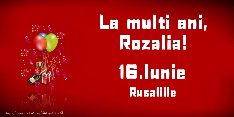 Felicitarea cu baloane și șampanie pe fundal roșu aprins de Ziua Numelui este un cadou gândit special pentru sărbătoare numelui Rozalia. Numele Rozalia devine piesa centrală a acestui dar unic, aducând sărbătoriților un strop de bucurie în aceată zi specială.