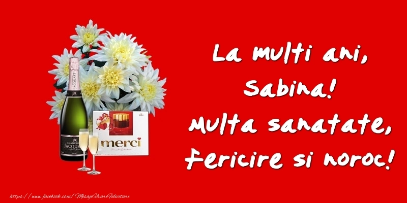 La multi ani, Sabina! Multa sanatate, fericire si noroc! | Felicitare cu flori, șampanie și ciocolată merci | Felicitari de zi de nastere