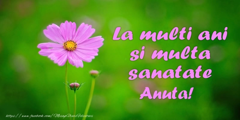Felicitarea cu flori mov pe fundal verde este ca o explozie de bucurie și culoare, iar numele Anuta este adăugat cu gingășie pentru a personaliza această experiență de sărbătoare. Este modul tău de a spune la mulți ani într-un mod unic și special!