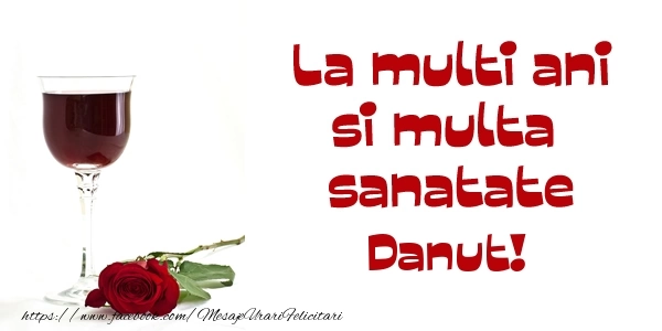 Această felicitare cu un trandafir și un pahar de vin pe fundal alb din colecția noastră de felicitari de zi de nastere cu numele Danut are o notă de originalitate și îți oferă ocazia să faci o persoană să se simtă specială datorită faptului că acolo este numele ei. Felicitarea se poate descărca gratuit sau se poate trimite prin Whatsapp, Facebook, Twitter, Pinterest. Imagine de zi de nastere cu un trandafir și un pahar de vin pe fundal alb cu dimensiunile 600px x 300px și cu textul La multi ani si multa sanatate Danut!.