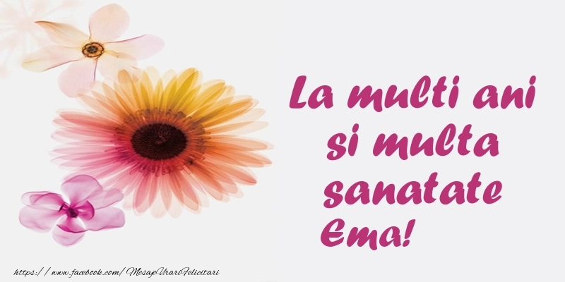 Această felicitare cu floricele pentru fete sau femei din colecția noastră de felicitari de la multi ani cu numele Ema are o notă de originalitate și îți oferă ocazia să faci o persoană să se simtă specială datorită faptului că acolo este numele ei. Felicitarea se poate descărca gratuit sau se poate trimite prin Whatsapp, Facebook, Twitter, Pinterest. Imagine de la mulți ani cu floricele pentru fete sau femei cu dimensiunile 800px x 400px și cu textul La multi ani si multa sanatate Ema!.