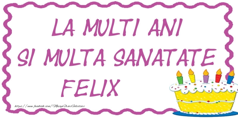 Fiecare detaliu al acestei felicitări cu cadru cu tort pe fundal alb transmite cele mai sincere urări de La Mulți Ani pentru ziua de naștere a destinatarului. Simplitatea fundalului alb îi permite tortului să strălucească în întreaga sa splendoare, simbolizând bucuria și fericirea din această zi specială. Felicitarea se poate descărca gratuit sau se poate trimite prin Whatsapp, Facebook, Twitter, Pinterest. Imaginea are dimensiunile 800px x 400px și textul La multi ani si multa sanatate Felix.