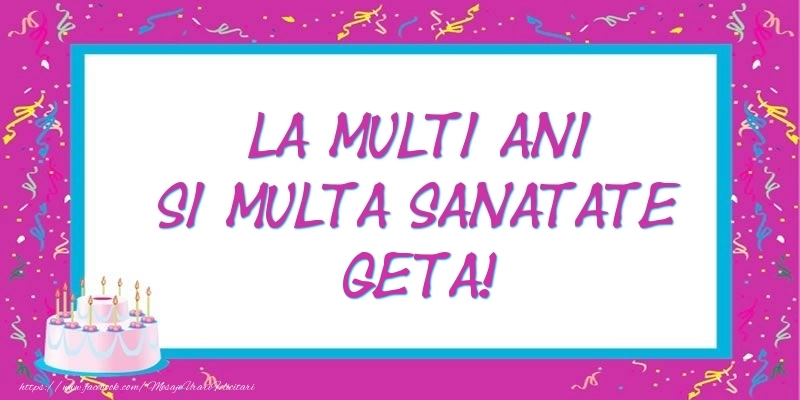 Această felicitare cu tort si bordura cu confetti din colecția noastră de felicitari de zi de nastere cu numele Geta are o notă de originalitate și îți oferă ocazia să faci o persoană să se simtă specială datorită faptului că acolo este numele ei. Felicitarea se poate descărca gratuit sau se poate trimite prin Whatsapp, Facebook, Twitter, Pinterest. Imagine de zi de nastere cu tort si bordura cu confetti cu dimensiunile 800px x 400px și cu textul La multi ani si multa sanatate Geta!.