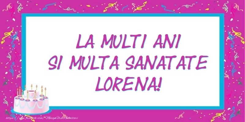 Această felicitare cu tort si bordura cu confetti din colecția noastră de felicitari de zi de nastere cu numele Lorena are o notă de originalitate și îți oferă ocazia să faci o persoană să se simtă specială datorită faptului că acolo este numele ei. Felicitarea se poate descărca gratuit sau se poate trimite prin Whatsapp, Facebook, Twitter, Pinterest. Imagine de zi de nastere cu tort si bordura cu confetti cu dimensiunile 800px x 400px și cu textul La multi ani si multa sanatate Lorena!.