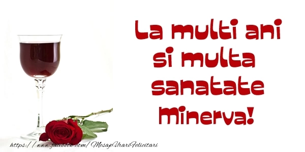 La multi ani si multa sanatate Minerva! | Felicitare cu un trandafir și un pahar de vin pe fundal alb | Felicitari de zi de nastere