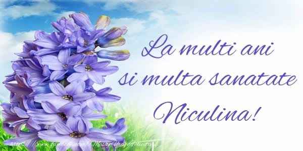 Albastrul, asociat cu liniștea și seninătatea, se împletește armonios cu farmecul natural al florilor, creând o imagine plină de grație și eleganță. Această felicitare este o alegere perfectă pentru a celebra ziua specială a cuiva drag precum Niculina. Trimiteți această felicitare plină de sentimente sincere pentru a aduce un zâmbet pe fața destinatarului în această zi minunată. Felicitarea este disponibilă pentru descărcare gratuită sau pentru distribuire prin intermediul Whatsapp, Facebook, Twitter și Pinterest. Textul La multi ani si multa sanatate Niculina! este integrat într-o imagine cu dimensiunile 600px x 300px.
