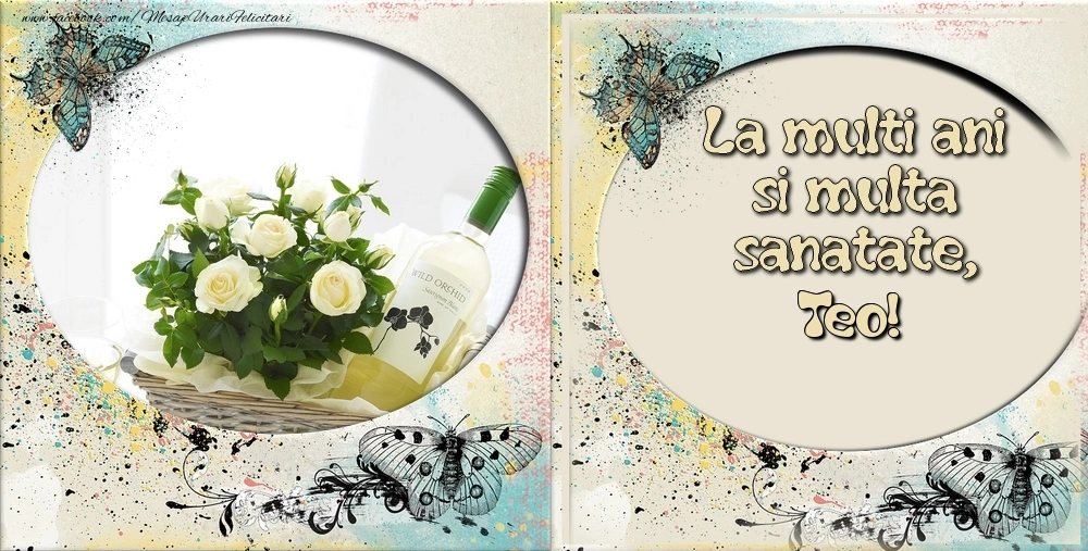 Fiecare fluture și fiecare petală de trandafir pe această felicitare reprezintă un zâmbet și o urare sinceră pentru ziua de naștere a destinatarului. Indiferent dacă este pentru o prietenă sau pentru partenerul tău de viață, această felicitare cu 4 fluturi, trandafiri și o sticlă de vin va fi cu siguranță un gest apreciat și memorabil. Felicitarea pentru Teo se poate descărca gratuit sau se poate trimite prin Whatsapp, Facebook, Twitter, Pinterest. Imaginea are dimensiunile 1000px x 507px și textul La multi ani si multa sanatate Teo!.