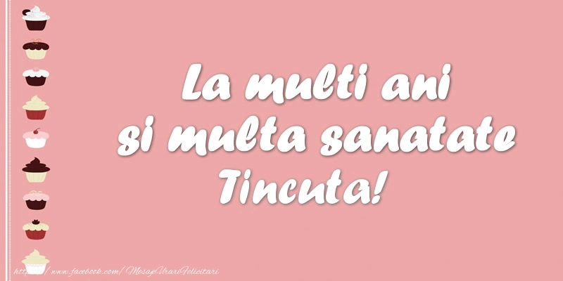 Înconjurați-vă prietenii sau familia cu bucuria și căldura acestei felicitări cu numele Tincuta. Este o felicitare simplă, dar plină de emoție și dragoste, perfectă pentru a celebra o zi de naștere memorabilă! Trimiteți această felicitare cu prăjiturele pe fundal roz pentru a împărtăși un zâmbet dulce și un sentiment de bucurie. Felicitarea se poate descărca gratuit sau se poate trimite prin Whatsapp, Facebook, Twitter, Pinterest. Imaginea are dimensiunile 800px x 400px și textul La multi ani si multa sanatate Tincuta!.