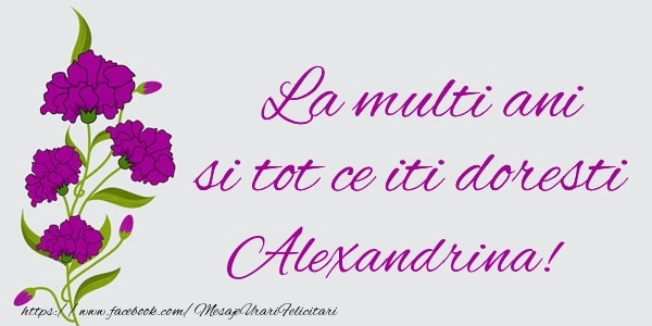 Această felicitare cu flori mov din colecția noastră de felicitari de zi de nastere cu numele Alexandrina are o notă de originalitate și îți oferă ocazia să faci o persoană să se simtă specială datorită faptului că acolo este numele ei. Felicitarea se poate descărca gratuit sau se poate trimite prin Whatsapp, Facebook, Twitter, Pinterest. Imagine de zi de nastere cu flori mov cu dimensiunile 600px x 300px și cu textul La multi ani si tot ce iti doresti Alexandrina!.