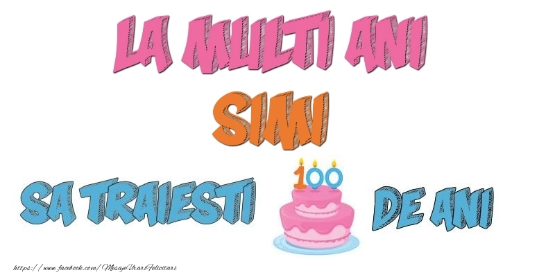 Această felicitare cu tort cu 100 din colecția noastră de felicitari de zi de nastere cu numele Simi are o notă de originalitate și îți oferă ocazia să faci o persoană să se simtă specială datorită faptului că acolo este numele ei. Felicitarea se poate descărca gratuit sau se poate trimite prin Whatsapp, Facebook, Twitter, Pinterest. Imagine de zi de nastere cu tort cu 100 cu dimensiunile 800px x 400px și cu textul La multi ani, Simi! Sa traiesti 100 de ani!.