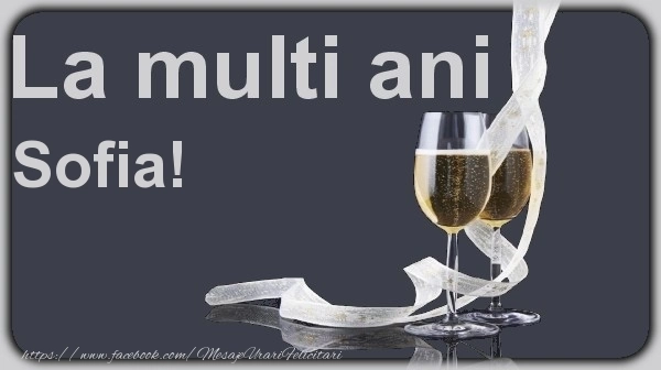 Această felicitare cu pahare de șampanie pe fundal gri din colecția noastră de felicitari de la multi ani cu numele Sofia are o notă de originalitate și îți oferă ocazia să faci o persoană să se simtă specială datorită faptului că acolo este numele ei. Felicitarea se poate descărca gratuit sau se poate trimite prin Whatsapp, Facebook, Twitter, Pinterest. Imagine de la mulți ani cu pahare de șampanie pe fundal gri cu dimensiunile 600px x 336px și cu textul La multi ani Sofia.