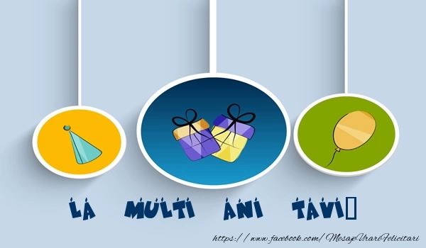 Felicitarea cu cadouri, balon si coif de hârtie pe fundal este ca o explozie de bucurie și culoare, iar numele Tavi este adăugat cu gingășie pentru a personaliza această experiență de sărbătoare. Este modul tău de a spune la mulți ani într-un mod unic și special!