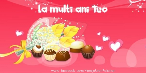 La multi ani Teo | Felicitare cu flori, inimioare și bomboane | Felicitari de zi de nastere