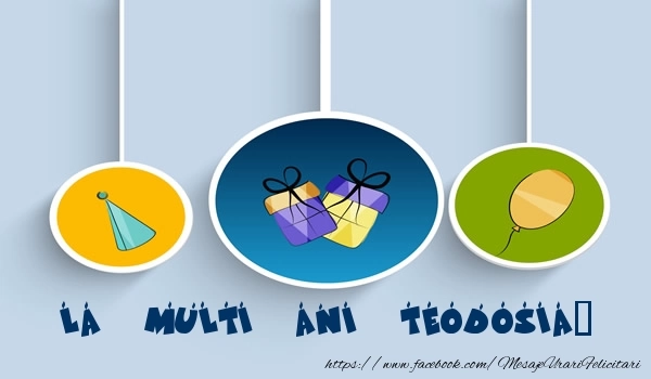 La multi ani Teodosia | Felicitare cu cadouri, balon si coif de hârtie pe fundal | Felicitari de la multi ani