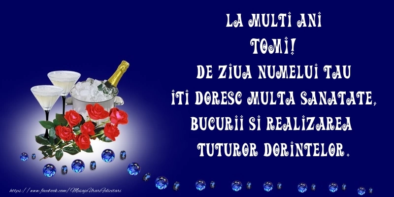 La Multi Ani Tomi, de ziua numelui tau iti doresc multa sanatate, bucurii si realizarea tuturor dorintelor. | Felicitare cu flori și șampanie pe fundal albastru | Felicitari de Ziua Numelui