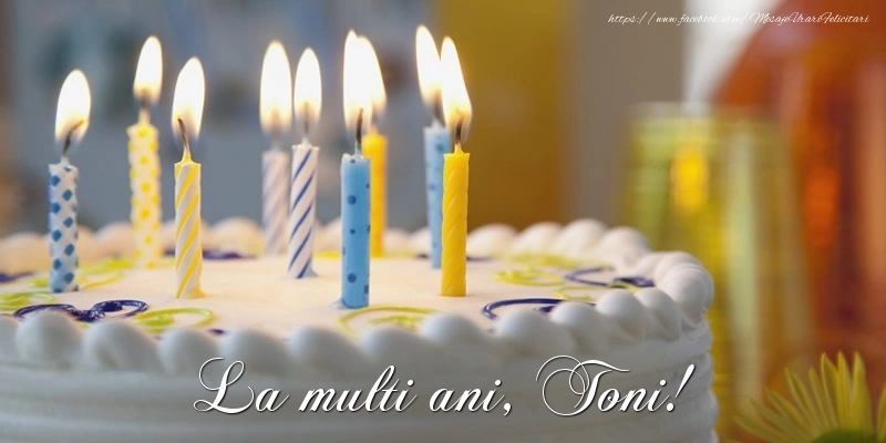 Această felicitare cu tort de frișca cu lumânări din colecția noastră de felicitari de zi de nastere cu numele Toni are o notă de originalitate și îți oferă ocazia să faci o persoană să se simtă specială datorită faptului că acolo este numele ei. Felicitarea se poate descărca gratuit sau se poate trimite prin Whatsapp, Facebook, Twitter, Pinterest. Imagine de zi de nastere cu tort de frișca cu lumânări cu dimensiunile 800px x 400px și cu textul La multi ani, Toni!.