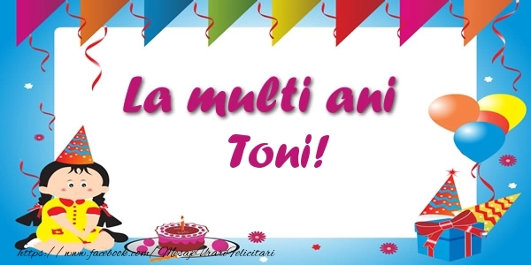La multi ani Toni! | Felicitare cu aranjament cu o fetiță, baloane, tort și confeti | Felicitari de zi de nastere