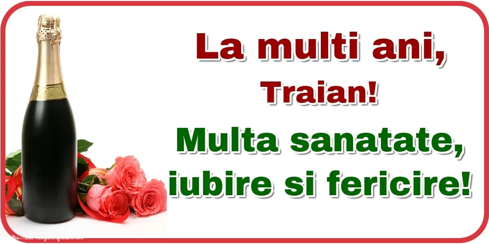 Felicitarea cu trandafiri și șampanie pe fundal alb cu chenar roșu este ca o explozie de bucurie și culoare, iar numele Traian este adăugat cu gingășie pentru a personaliza această experiență de sărbătoare. Este modul tău de a spune la mulți ani într-un mod unic și special!
