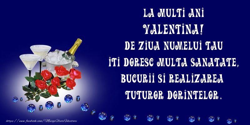 La Multi Ani Valentina, de ziua numelui tau iti doresc multa sanatate, bucurii si realizarea tuturor dorintelor. | Felicitare cu flori și șampanie pe fundal albastru | Felicitari de Ziua Numelui