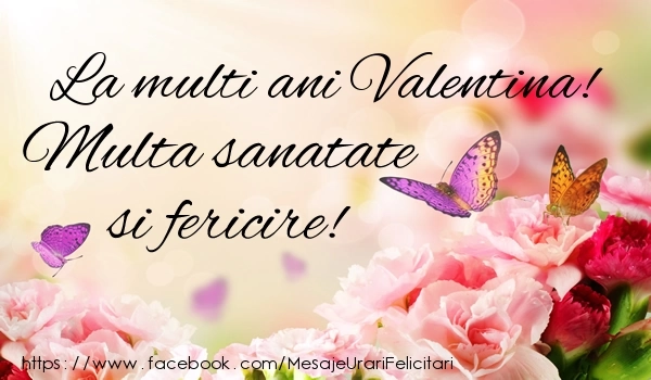 Această felicitare cu fluturi și flori din colecția noastră de felicitari de la multi ani cu numele Valentina are o notă de originalitate și îți oferă ocazia să faci o persoană să se simtă specială datorită faptului că acolo este numele ei. Felicitarea se poate descărca gratuit sau se poate trimite prin Whatsapp, Facebook, Twitter, Pinterest. Imagine de la mulți ani cu fluturi și flori cu dimensiunile 600px x 350px și cu textul La multi ani Valentina! Multa sanatate si fericire!.