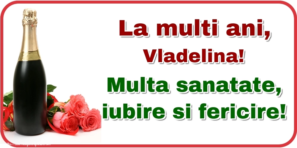 Felicitarea cu trandafiri și șampanie pe fundal alb cu chenar roșu este ca o explozie de bucurie și culoare, iar numele Vladelina este adăugat cu gingășie pentru a personaliza această experiență de sărbătoare. Este modul tău de a spune la mulți ani într-un mod unic și special!