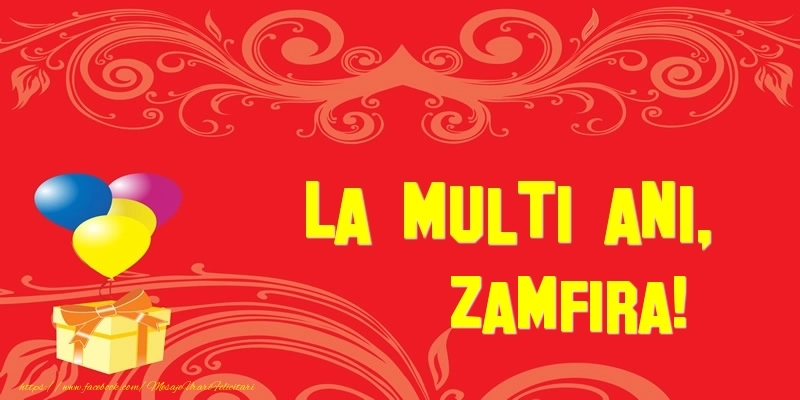 Felicitarea cu fundal roșu cu cadouri și trei baloane este ca o explozie de bucurie și culoare, iar numele Zamfira este adăugat cu gingășie pentru a personaliza această experiență de sărbătoare. Este modul tău de a spune la mulți ani într-un mod unic și special!