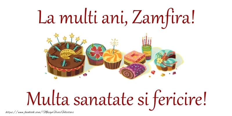 Această felicitare cu tort și prăjituri din colecția noastră de felicitari de la multi ani cu numele Zamfira are o notă de originalitate și îți oferă ocazia să faci o persoană să se simtă specială datorită faptului că acolo este numele ei. Felicitarea se poate descărca gratuit sau se poate trimite prin Whatsapp, Facebook, Twitter, Pinterest. Imagine de la mulți ani cu tort și prăjituri cu dimensiunile 800px x 400px și cu textul La multi ani, Zamfira! Multa sanatate si fericire!.
