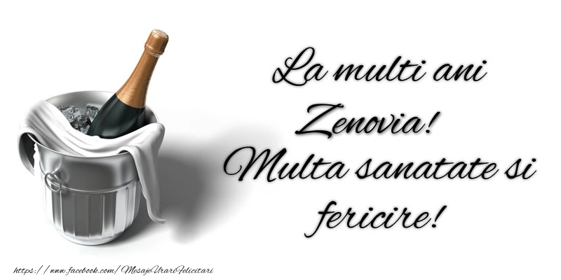 Fundalul alb adaugă un aer de rafinament și puritate, subliniind importanța momentului. Trimiteți această felicitare pentru a sărbători cu bucurie ziua de naștere a unei persoane dragi pe nume Zenovia. Această felicitare cu șampanie în frapieră pe fundal alb este simplă, dar plină de eleganță și farmec, care va aduce un zâmbet pe fața celui care o primește. Felicitarea se poate descărca gratuit sau se poate trimite prin Whatsapp, Facebook, Twitter, Pinterest. Imaginea are dimensiunile 800px x 400px și textul La multi ani Zenovia! Multa sanatate si fericire!.