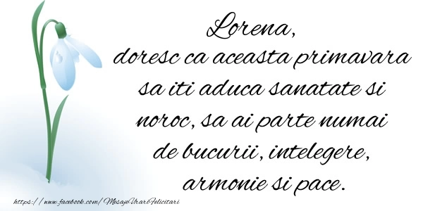 Transformă Mărțișorul într-o experiență personală! Această felicitare de 1 Martie cu ghiocel în zăpadă pentru femei este gândită și creată cu atenție, iar numele Lorena se îmbină armonios în designul primăvăratic. O urare cu adevărat specială pentru o persoană unică.