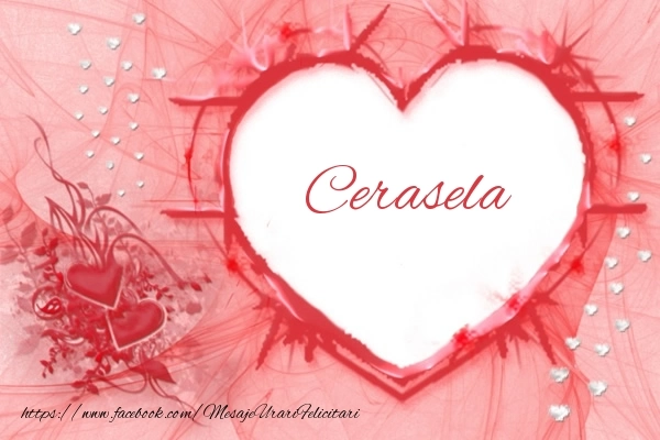 Această felicitare cu inimioară pentru femei sau fete din colecția noastră de felicitari de dragoste cu numele Cerasela are o notă de originalitate și îți oferă ocazia să faci o persoană să se simtă specială datorită faptului că acolo este numele ei. Felicitarea se poate descărca gratuit sau se poate trimite prin Whatsapp, Facebook, Twitter, Pinterest. Imagine de iubire cu inimioară pentru femei sau fete cu dimensiunile 600px x 400px și cu textul Love Cerasela.
