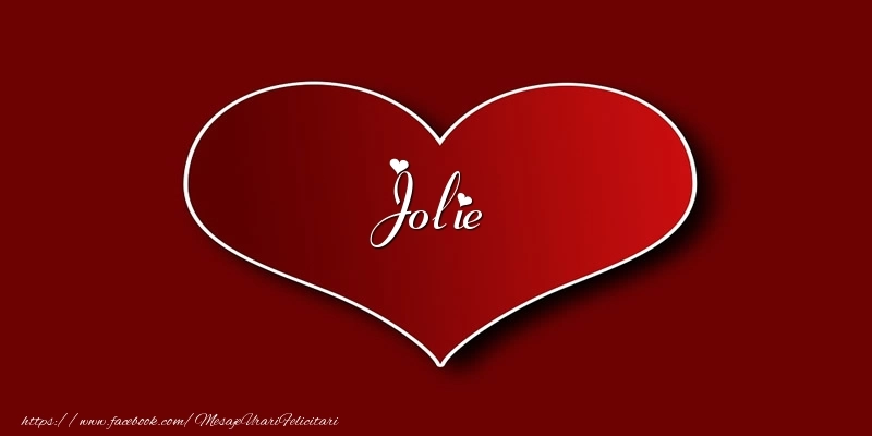 Această felicitare cu inimă roșu aprins din colecția noastră de felicitari de dragoste cu numele Jolie are o notă de originalitate și îți oferă ocazia să faci o persoană să se simtă specială datorită faptului că acolo este numele ei. Felicitarea se poate descărca gratuit sau se poate trimite prin Whatsapp, Facebook, Twitter, Pinterest. Imagine de iubire cu inimă roșu aprins cu dimensiunile 800px x 400px și cu textul Love Jolie.