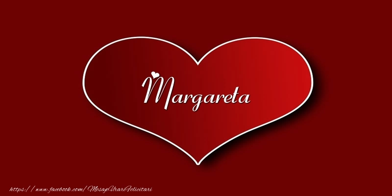 Această felicitare cu inimă roșu aprins din colecția noastră de felicitari de dragoste cu numele Margareta are o notă de originalitate și îți oferă ocazia să faci o persoană să se simtă specială datorită faptului că acolo este numele ei. Felicitarea se poate descărca gratuit sau se poate trimite prin Whatsapp, Facebook, Twitter, Pinterest. Imagine de iubire cu inimă roșu aprins cu dimensiunile 800px x 400px și cu textul Love Margareta.