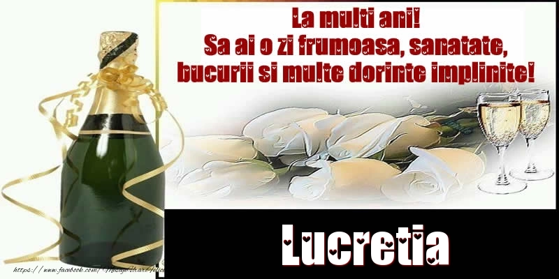 Această felicitare cu șampanie și trandafiri din colecția noastră de felicitari de la multi ani cu numele Lucretia are o notă de originalitate și îți oferă ocazia să faci o persoană să se simtă specială datorită faptului că acolo este numele ei. Felicitarea se poate descărca gratuit sau se poate trimite prin Whatsapp, Facebook, Twitter, Pinterest. Imagine de la mulți ani cu șampanie și trandafiri cu dimensiunile 800px x 400px și cu textul Lucretia La multi ani! Sa ai o zi frumoasa, sanatate, bucurii si multe dorinte implinite!.