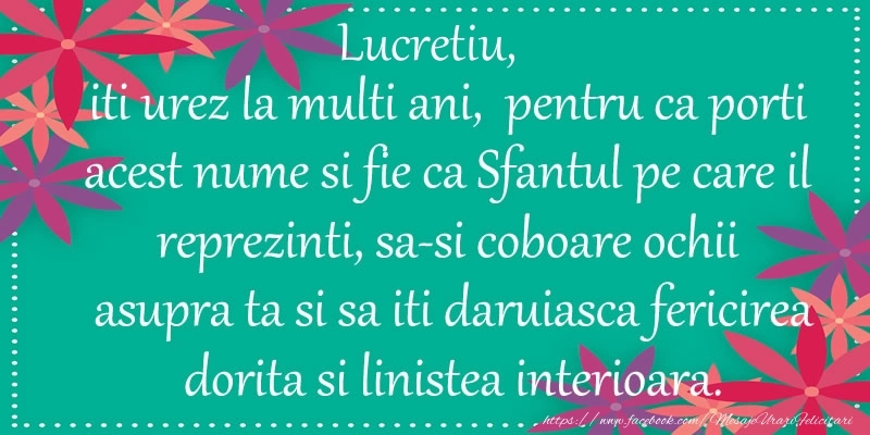 Lucretiu, iti urez la multi ani, pentru ca porti acest nume si fie ca Sfantul pe care il reprezinti, sa-si coboare ochii asupra ta si sa iti daruiasca fericirea dorita si linistea interioara.