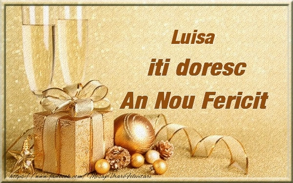 Această felicitare cu globuri, șampanie și cadou din colecția noastră de felicitari de Anul Nou cu numele Luisa are o notă de originalitate și îți oferă ocazia să faci o persoană să se simtă specială datorită faptului că acolo este numele ei. Felicitarea se poate descărca gratuit sau se poate trimite prin Whatsapp, Facebook, Twitter, Pinterest. Imagine de Anul Nou cu globuri, șampanie și cadou cu dimensiunile 600px x 375px și cu textul Luisa iti urez un An Nou Fericit.