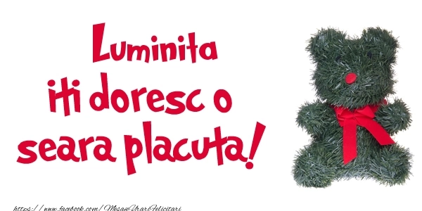 Această felicitare cu ursuleț de pluș din colecția noastră de felicitari de buna seara cu numele Luminita are o notă de originalitate și îți oferă ocazia să faci o persoană să se simtă specială datorită faptului că acolo este numele ei. Felicitarea se poate descărca gratuit sau se poate trimite prin Whatsapp, Facebook, Twitter, Pinterest. Imagine de bună seara cu ursuleț de pluș cu dimensiunile 600px x 300px și cu textul Luminita iti doresc o seara placuta!.