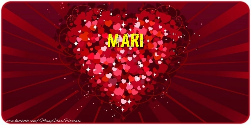 Această felicitare cu inimă facută din mai multe inimioare din colecția noastră de felicitari de dragoste cu numele Mari are o notă de originalitate și îți oferă ocazia să faci o persoană să se simtă specială datorită faptului că acolo este numele ei. Felicitarea se poate descărca gratuit sau se poate trimite prin Whatsapp, Facebook, Twitter, Pinterest. Imagine de iubire cu inimă facută din mai multe inimioare cu dimensiunile 800px x 400px și cu textul Mari.