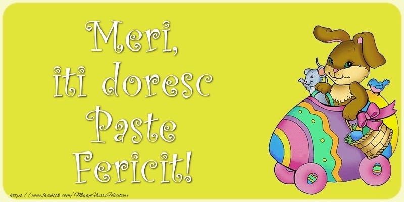 Această felicitare cu iepuraș în mașinuță din colecția noastră de felicitari de Paste cu numele Meri are o notă de originalitate și îți oferă ocazia să faci o persoană să se simtă specială datorită faptului că acolo este numele ei. Felicitarea se poate descărca gratuit sau se poate trimite prin Whatsapp, Facebook, Twitter, Pinterest. Imagine de Paște cu iepuraș în mașinuță cu dimensiunile 800px x 400px și cu textul Meri, iti doresc Paste Fericit!.