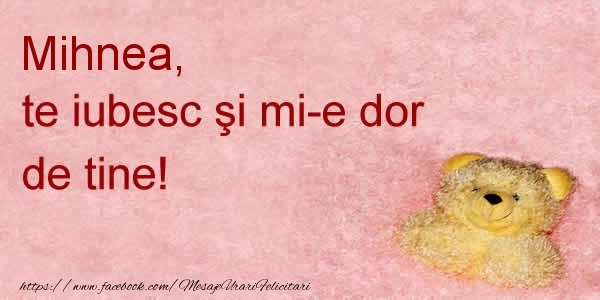 Această felicitare cu ursuleț pentru femei sau bărbați din colecția noastră de felicitari de dragoste cu numele Mihnea are o notă de originalitate și îți oferă ocazia să faci o persoană să se simtă specială datorită faptului că acolo este numele ei. Felicitarea se poate descărca gratuit sau se poate trimite prin Whatsapp, Facebook, Twitter, Pinterest. Imagine de iubire cu ursuleț pentru femei sau bărbați cu dimensiunile 600px x 300px și cu textul Mihnea te iubesc si mi-e dor de tine! .