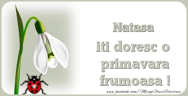 Transformă Mărțișorul într-o experiență personală! Această felicitare de 1 Martie cu ghiocel și buburuză pentru noroc este gândită și creată cu atenție, iar numele Natasa se îmbină armonios în designul primăvăratic. O urare cu adevărat specială pentru o persoană unică.
