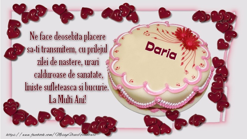 Ne face deosebita placere sa-ti transmitem, cu prilejul  zilei de nastere, urari  calduroase de sanatate, liniste sufleteasca si bucurie.  La Multi Ani! Daria | Felicitare cu tort pe fundal cu inimioare | Felicitari de zi de nastere