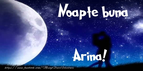 Această felicitare cu doi îndrăgostiți cu luna și stelele in fundal din colecția noastră de felicitari de noapte buna cu numele Arina are o notă de originalitate și îți oferă ocazia să faci o persoană să se simtă specială datorită faptului că acolo este numele ei. Felicitarea se poate descărca gratuit sau se poate trimite prin Whatsapp, Facebook, Twitter, Pinterest. Imagine de noapte bună cu doi îndrăgostiți cu luna și stelele in fundal cu dimensiunile 600px x 300px și cu textul Noapte buna Arina!.
