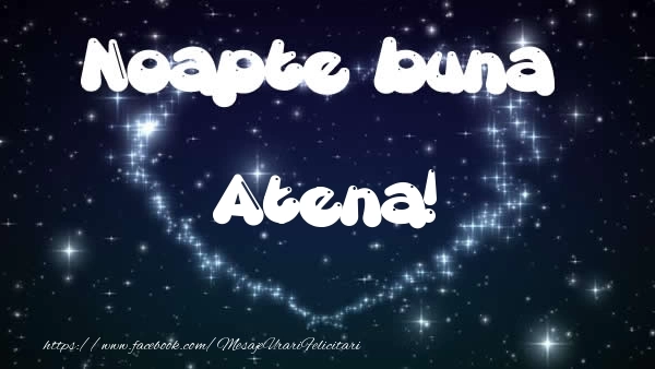 Această felicitare cu stele și o inimioară din colecția noastră de felicitari de noapte buna cu numele Atena are o notă de originalitate și îți oferă ocazia să faci o persoană să se simtă specială datorită faptului că acolo este numele ei. Felicitarea se poate descărca gratuit sau se poate trimite prin Whatsapp, Facebook, Twitter, Pinterest. Imagine de noapte bună cu stele și o inimioară cu dimensiunile 600px x 338px și cu textul Noapte buna Atena!.