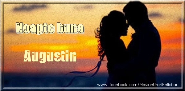 Această felicitare cu 2 îndrăgostiți la apusul soarelui din colecția noastră de felicitari de noapte buna cu numele Augustin are o notă de originalitate și îți oferă ocazia să faci o persoană să se simtă specială datorită faptului că acolo este numele ei. Felicitarea se poate descărca gratuit sau se poate trimite prin Whatsapp, Facebook, Twitter, Pinterest. Imagine de noapte bună cu 2 îndrăgostiți la apusul soarelui cu dimensiunile 600px x 296px și cu textul Noapte buna Augustin.
