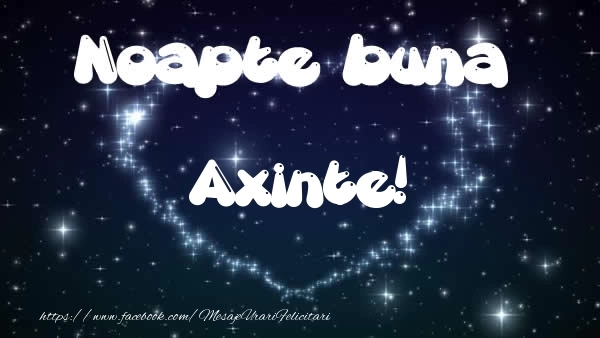 Această felicitare cu stele și o inimioară din colecția noastră de felicitari de noapte buna cu numele Axinte are o notă de originalitate și îți oferă ocazia să faci o persoană să se simtă specială datorită faptului că acolo este numele ei. Felicitarea se poate descărca gratuit sau se poate trimite prin Whatsapp, Facebook, Twitter, Pinterest. Imagine de noapte bună cu stele și o inimioară cu dimensiunile 600px x 338px și cu textul Noapte buna Axinte!.