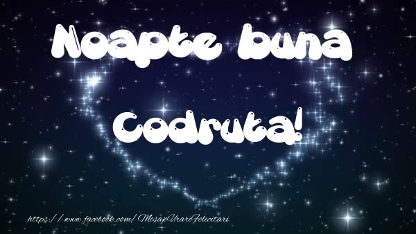 Această felicitare cu stele și o inimioară din colecția noastră de felicitari de noapte buna cu numele Codruta are o notă de originalitate și îți oferă ocazia să faci o persoană să se simtă specială datorită faptului că acolo este numele ei. Felicitarea se poate descărca gratuit sau se poate trimite prin Whatsapp, Facebook, Twitter, Pinterest. Imagine de noapte bună cu stele și o inimioară cu dimensiunile 600px x 338px și cu textul Noapte buna Codruta!.