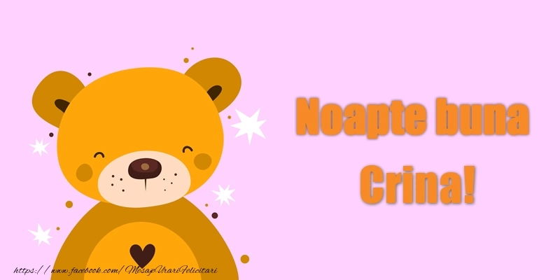 Ca un orășel magic al viselor, această felicitare cu ursuleț cu inimioară pentru băieți sau fete de noapte bună special creată pentru Crina te invită să explorezi lumea viselor. Fiecare lumină strălucitoare aduce cu sine promisiunea unei nopți pline de vise frumoase.