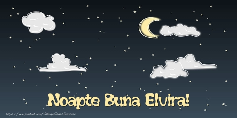 Această felicitare cu cerul cu luna, stelele și norișori din colecția noastră de felicitari de noapte buna cu numele Elvira are o notă de originalitate și îți oferă ocazia să faci o persoană să se simtă specială datorită faptului că acolo este numele ei. Felicitarea se poate descărca gratuit sau se poate trimite prin Whatsapp, Facebook, Twitter, Pinterest. Imagine de noapte bună cu cerul cu luna, stelele și norișori cu dimensiunile 800px x 400px și cu textul Noapte Buna Elvira!.